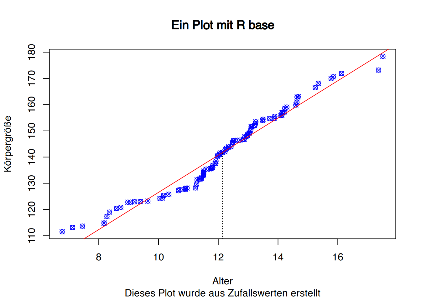 Mit der Funktion lines() können Linien hinzugefügt werden. Dafür übergeben wir die entsprechenden Koordinaten des Start- und Endpunkts. So können wir z.B. den Mittelwert für Alter markieren.