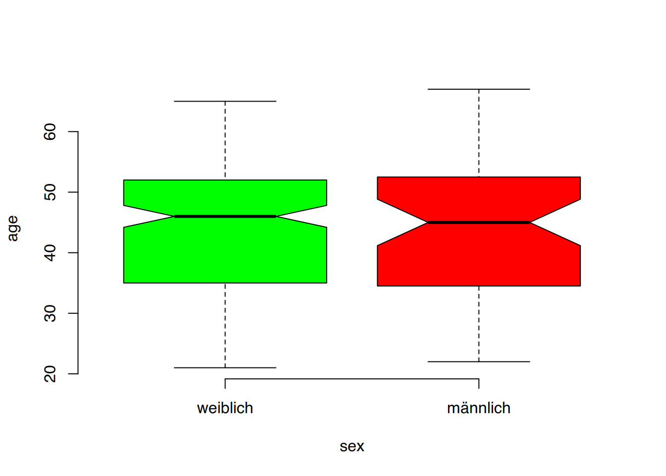 boxplot(age ~ sex, data=nw, frame = FALSE, col=c("green", "red"), notch = TRUE)
