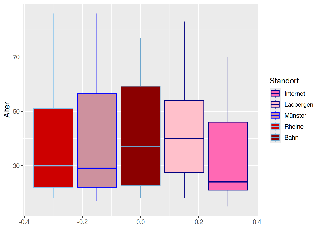 Wenn wir das Alter der Probanden nach Standort gruppieren, wählt ggplot() diese Farben aus: