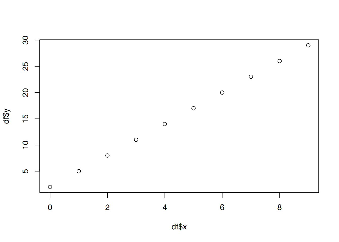 df <- data.frame(x = c( 0, 1, 2, 3, 4, 5, 6, 7, 8, 9 ),