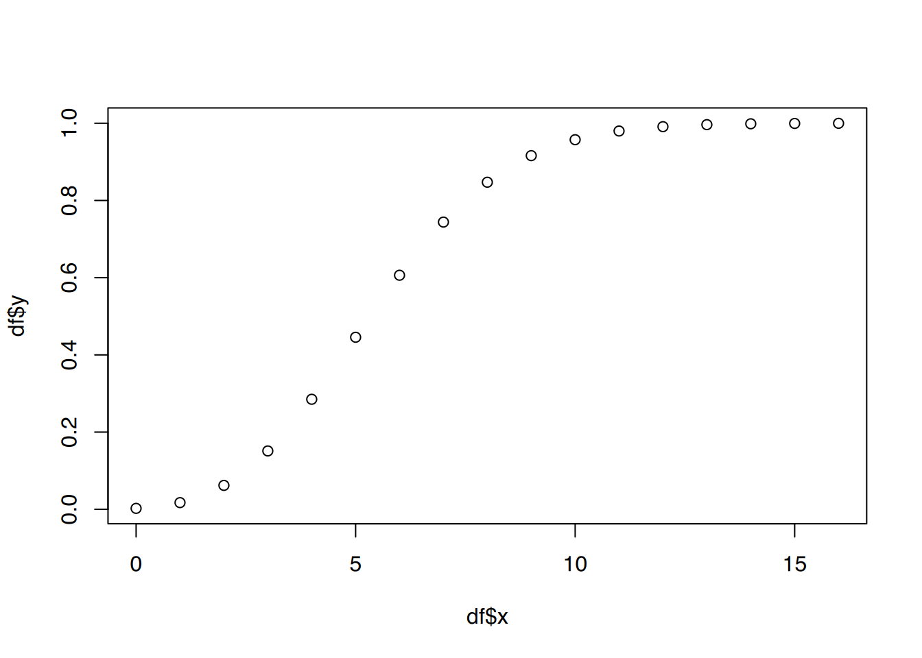 # mögliche Ausprägungen von xx <-0:10df =data.frame(x, y=pbinom(x, size =10, prob =0.50))# plot()plot(df$x, df$y)