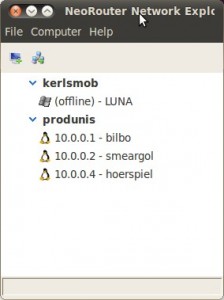 NeoRouter ist ein so genannter ZeroConf-VPN-Dienst, der es erlaubt, sich mit Freunden oder Kollegen über das Internet zu einem “virtuellen LAN” zusammenzuschließen. Ein ähnlicher Dienst ist Hamachi, jedoch hat Hamachi den Support für Linux eingestellt und bietet nicht so viele Funktionen wie NeoRouter.